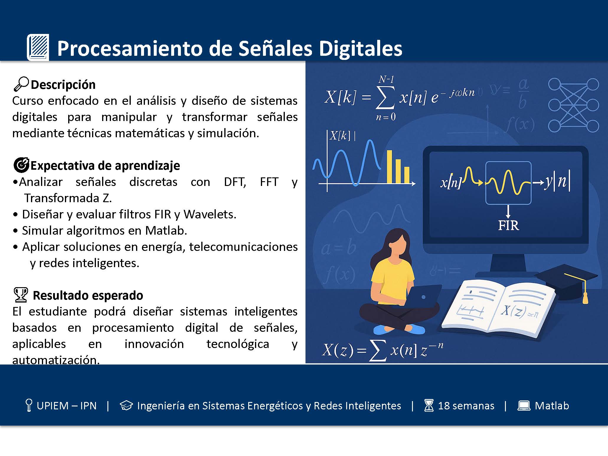 El curso prepara al estudiante para utilizar el procesamiento digital de señales como base en el diseño de sistemas inteligentes, orientados a la innovación tecnológica y al desarrollo de aplicaciones en energía, telecomunicaciones y automatización.